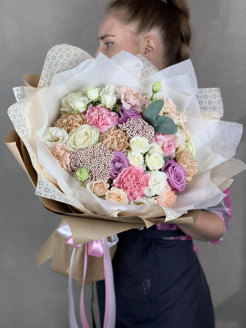 Кустовые розы и эустомы собраны в компактную форму с мягкими линиями. Сочетание нескольких оттенков создаёт живописный эффект без лишней пышности.