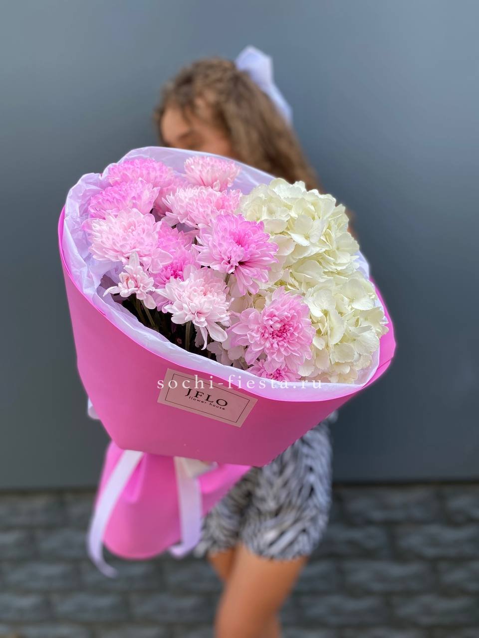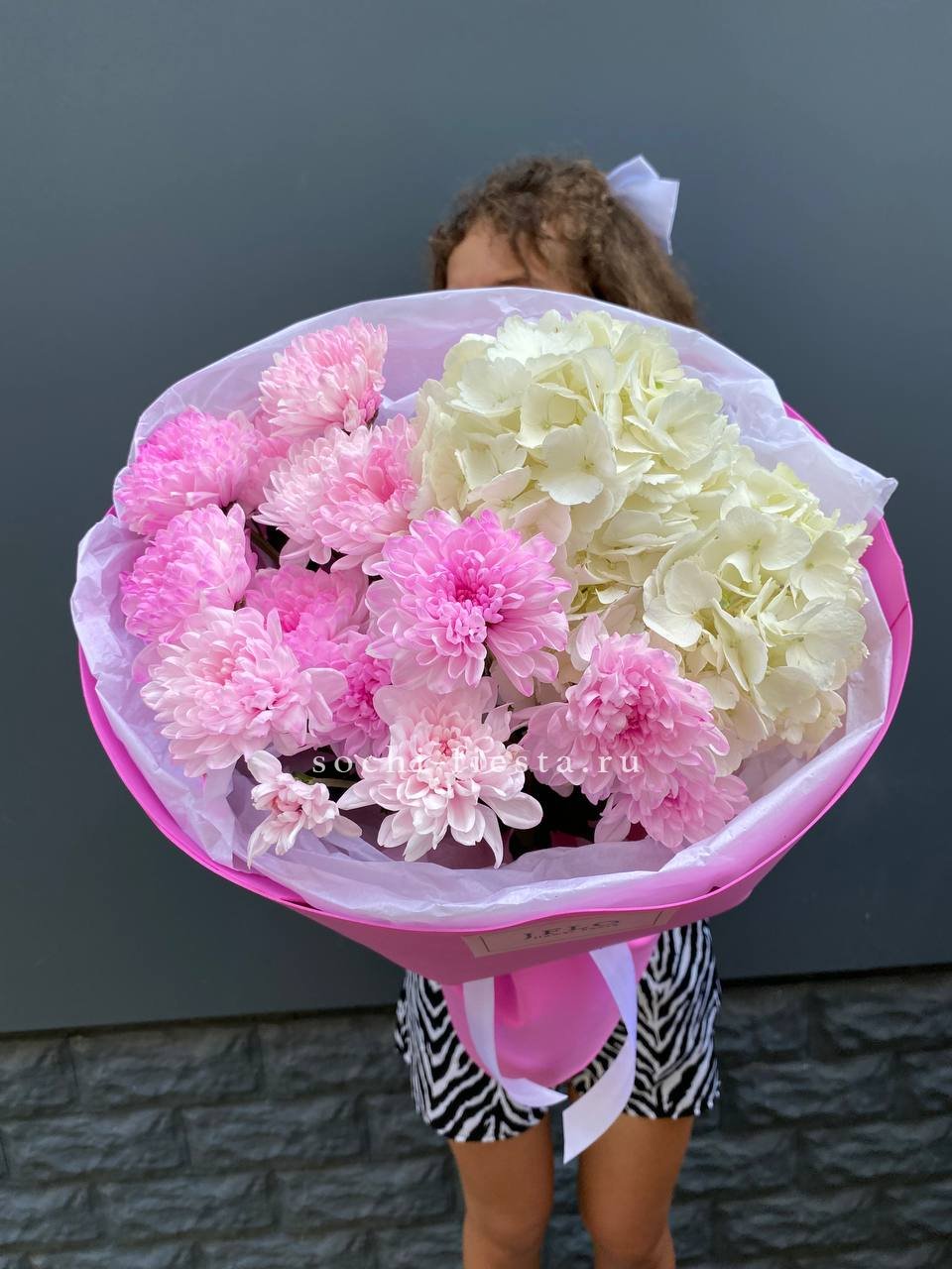 Хризантемы и гортензии собраны в свободный силуэт с легкими перепадами высоты. Дизайнерская пленка фиксирует композицию и оставляет ощущение воздуха между соцветиями.