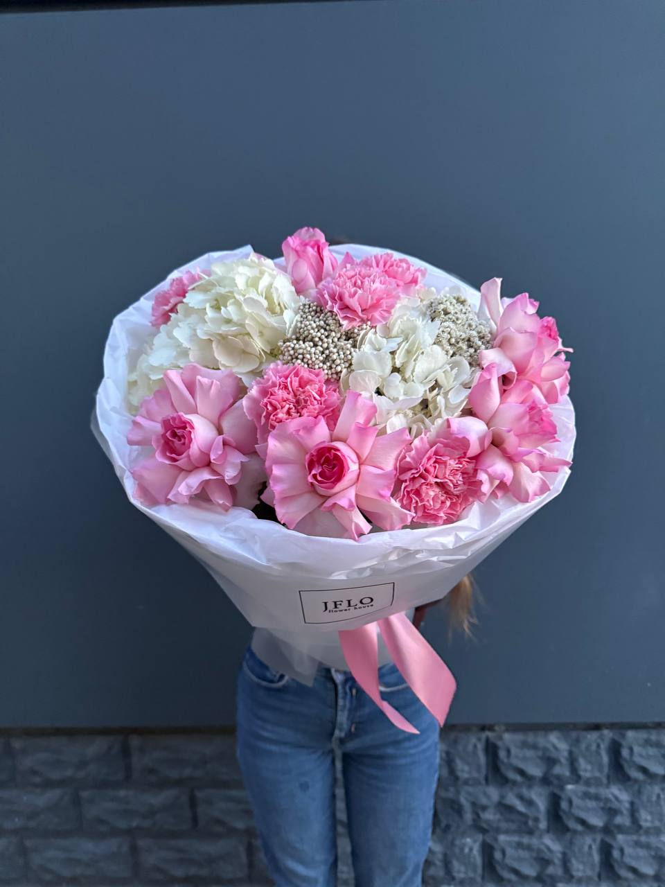гортензия, кустовая роза, розовая роза, дельфиниум/маттиола/львиный зев, амарантус, эвкалипт или аналог, декор, корейская пленка, лента.