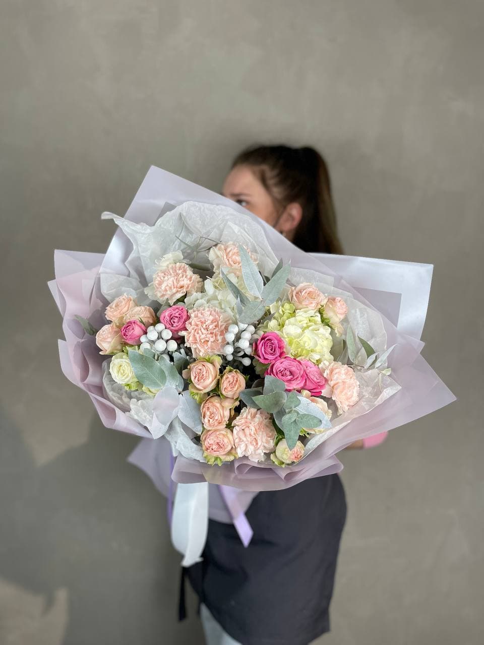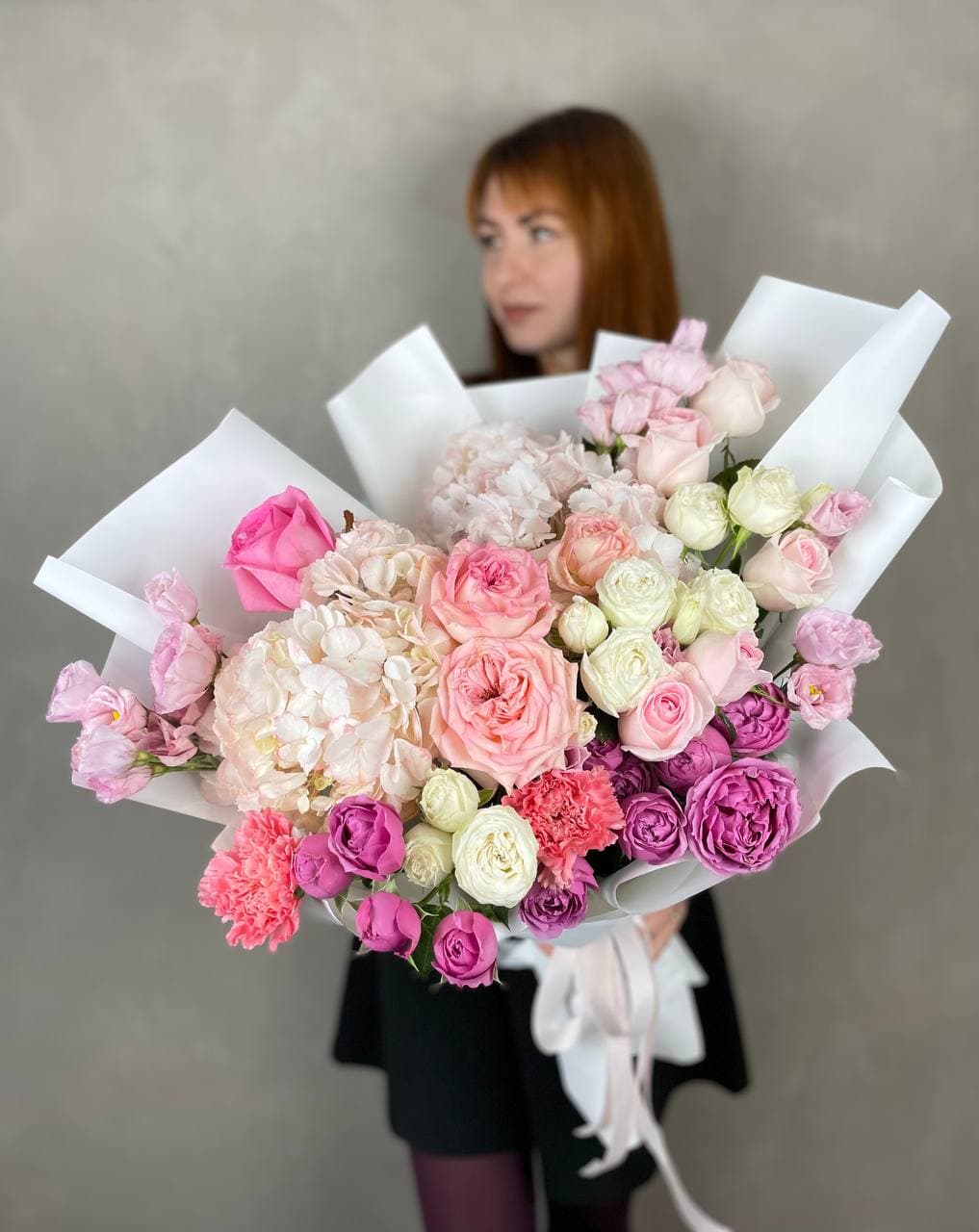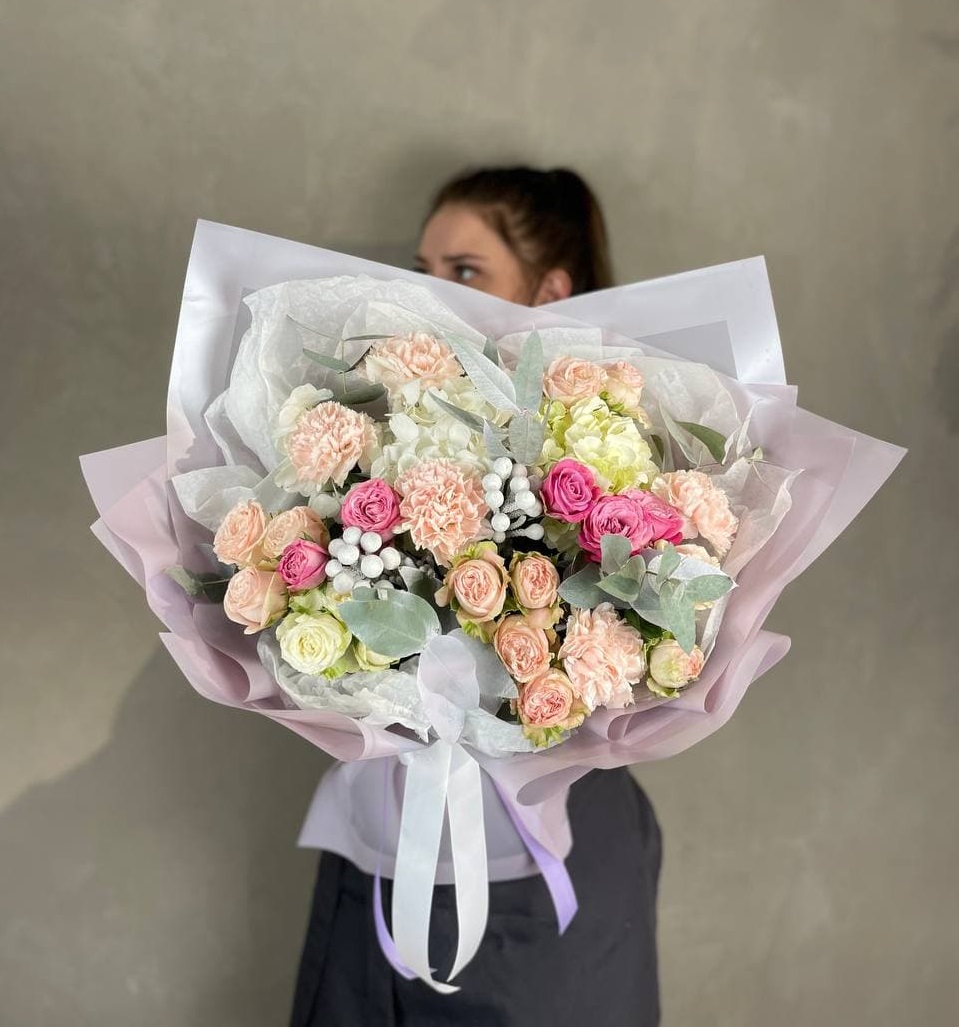 Пышная шапка из гортензии и пионовидных роз собрана с филигранной точностью. Диантус и эустома создают воздушные переходы между крупными соцветиями, а озотамнус добавляет графичные вертикали. Букет для тех, кто понимает язык авторской флористики.