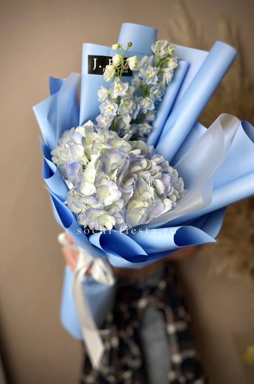 Яркий микс голубых и синих оттенков создает ощущение прохлады и воздуха. Пышные шапки гортензии переплетаются с вертикальными линиями дельфиниума, формируя объемную композицию с выразительным силуэтом.