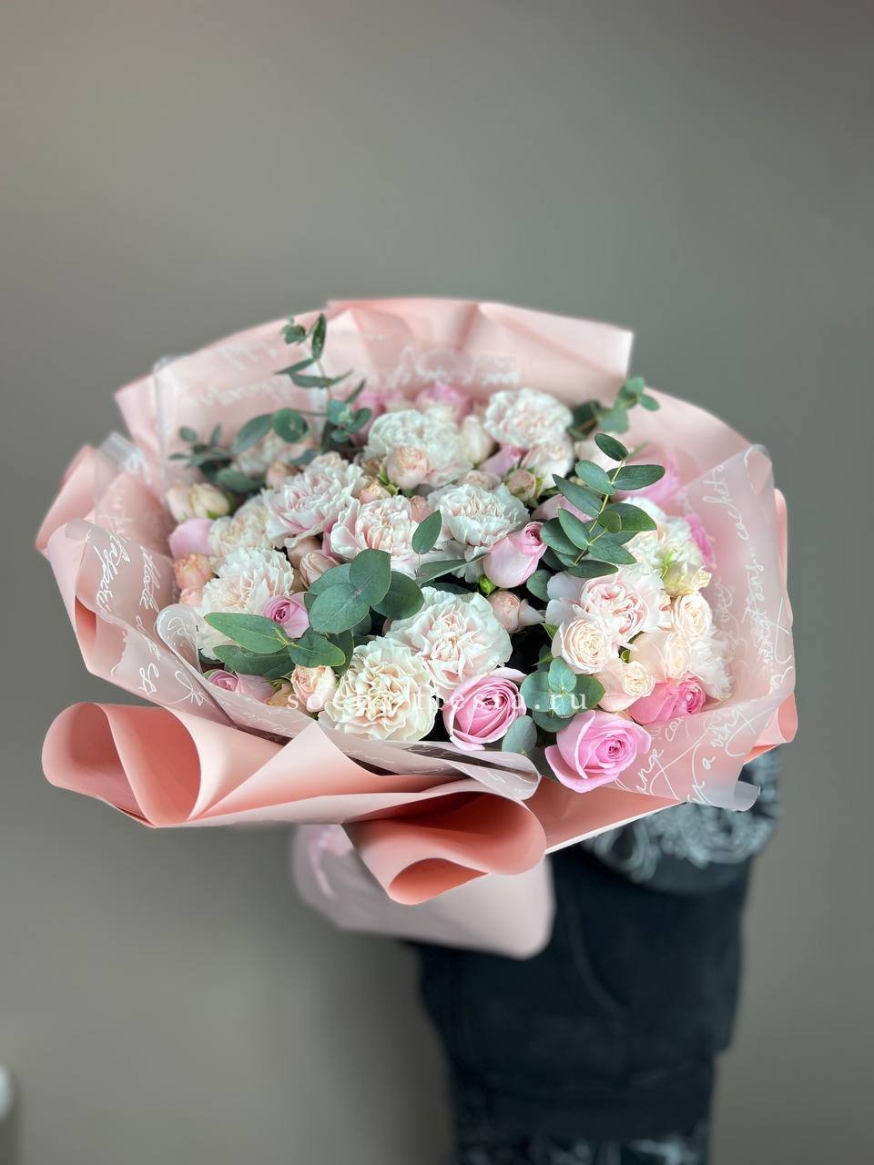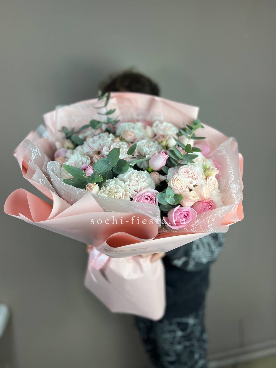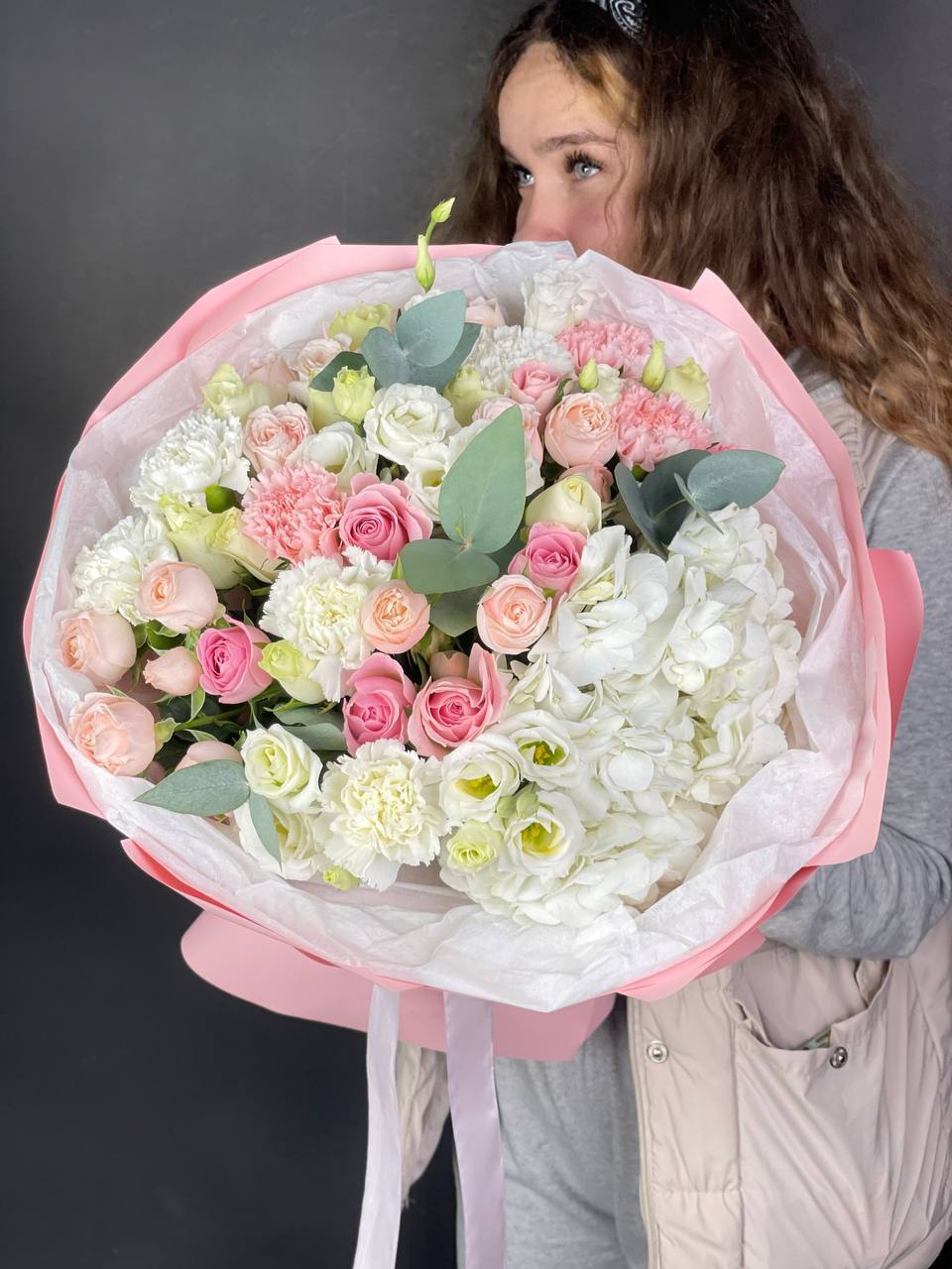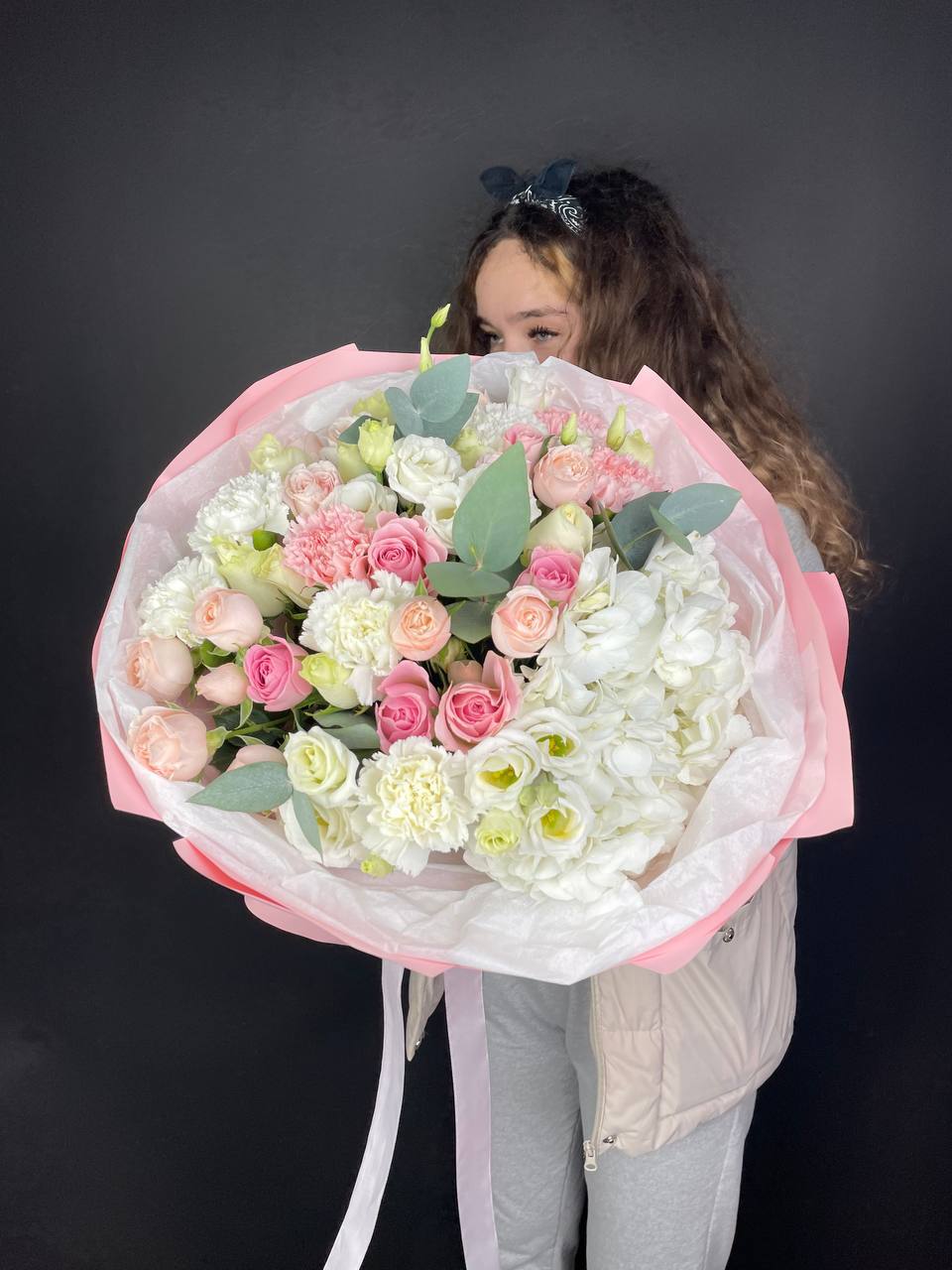 Воздушная композиция с белоснежной гортензией и пионовидными розами в окружении эвкалипта и пампасной травы. Светлая палитра и природная текстура создают ощущение летнего сада. Гармония форм и естественная свежесть в каждом элементе.