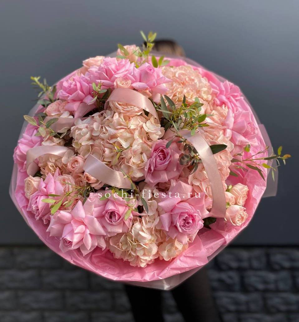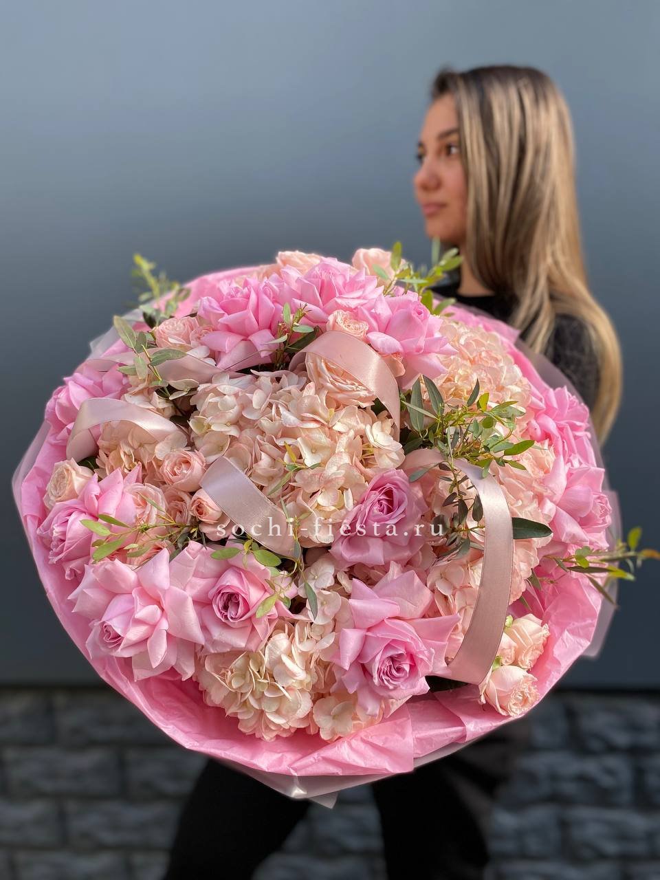 гортензия, розы, диантусы, хризантема, пионы (или пионовидные розы), эустома, корзина. Состав может меняться, в зависимости от сезона.