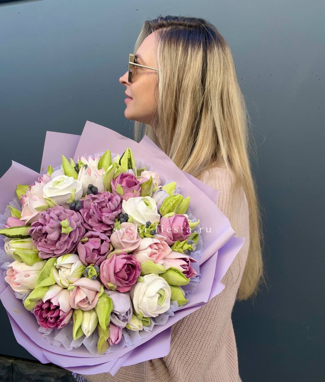 зефир в форме букета цветов. Состав: сахар, патока, пектин, агар, яблочное пюре, яичный белок, натуральный краситель, лимонная кислота. Цена за 1букет, размер М.